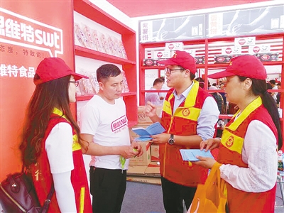 志愿者在食博會現(xiàn)場發(fā)放宣傳資料。