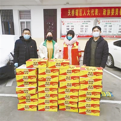 2月6日,志愿者楊英偉(左二)自費購買100箱方便面,分別送給召陵區(qū)東城街道辦事處、天橋街道辦事處和召陵區(qū)政協防疫值班點。記者 朱 紅 攝
