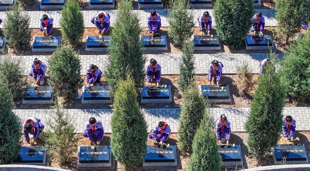 4月2日,河北省遵化市地北頭鎮(zhèn)學(xué)生在魯家峪烈士陵園向無名烈士獻(xiàn)花(無人機(jī)照片)。