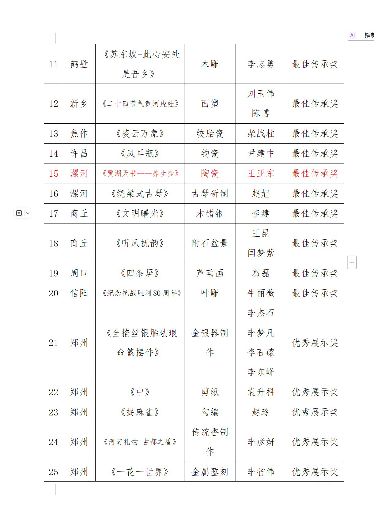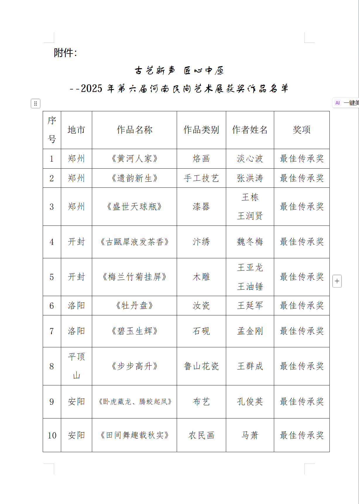據(jù)悉,根據(jù) 2025 河南惠民文化活動(dòng)總體安排,河南文化館組織開展的第六屆河南民間藝術(shù)展作品征集工作,經(jīng)全省縣、市各級(jí)推薦,共收到作品 30 類 1500 余件。經(jīng)專家評(píng)審,共評(píng)出最佳傳承獎(jiǎng)20 個(gè),優(yōu)秀獎(jiǎng)40 個(gè),別具匠心獎(jiǎng)60 個(gè),榮譽(yù)參展獎(jiǎng)20 個(gè)。(漯河市廣播電視臺(tái)網(wǎng)絡(luò)部記者:柴全偉)